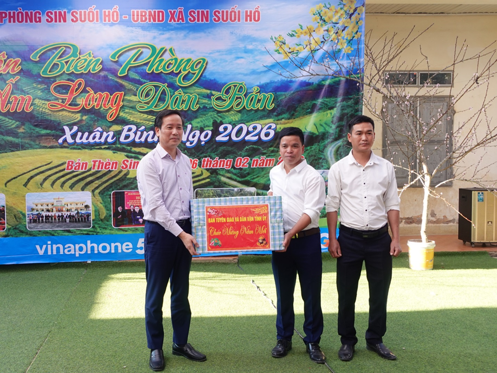 Dự Chương trình có các đồng chí: Lê Đức Dục - Ủy viên Ban Thường vụ, Trưởng Ban Tuyên giáo và Dân vận Tỉnh ủy; Đại tá Nguyễn Ngọc Ánh - Phó Chỉ huy trưởng kiêm tham mưu trưởng Ban Chỉ huy Bộ đội Biên phòng tỉnh; lãnh đạo Đồn Biên phòng Sin Suối Hồ; Thường trực Đảng ủy, HĐND, UBND, Ủy ban MTTQ Việt Nam xã; đại diện các đơn vị tài trợ và đông đảo Nhân dân bản Thèn Sin 2.