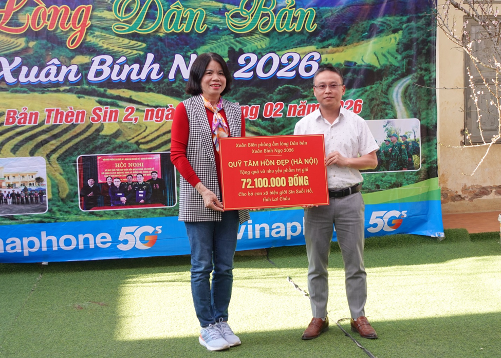 Đại diện Quỹ tâm hồn đẹp Hà Nội hỗ trợ kinh phí chương trình "Xuân biên phòng ấm lòng dân bản" cho xã Sin Suối Hồ.