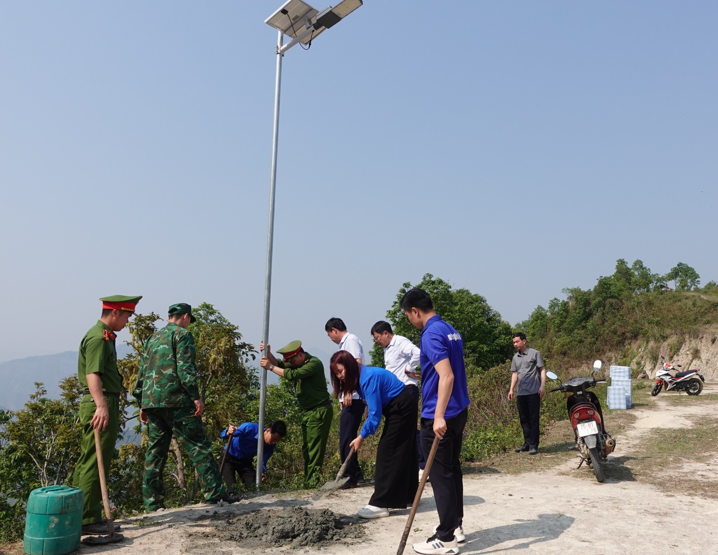 Các lực lượng cùng nhau tham gia lặp đặt các cột đèn năng lượng mặt trời.