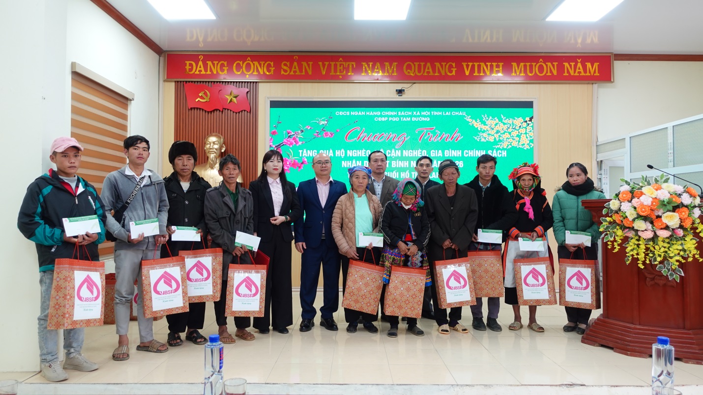 Tại Chương trình, Công đoàn bộ phận Phòng giao dịch Ngân hàng CSXH Tam Đường đã trao quà tết cho 15 hộ nghèo, cận nghèo, gia đình chính sách trên địa bàn xã. Mỗi suất quà trị giá 700.000 đồng gồm tiền mặt và bánh kẹo, nước mắm, dầu ăn…