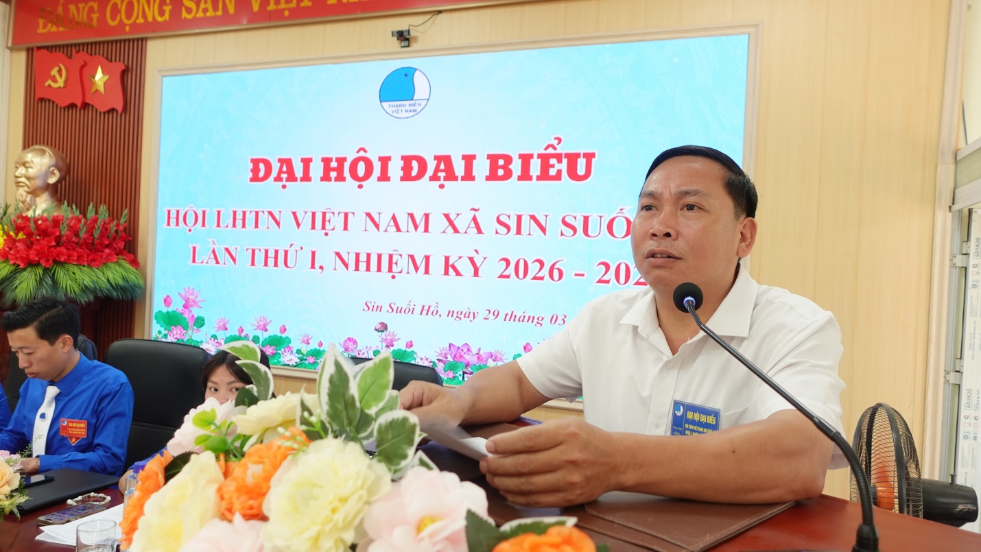 Sáng nay 29/3/2026, Hội LHTN Việt Nam xã Sin Suối Hồ long trọng tổ chức Đại hội đại biểu lần thứ I, nhiệm kỳ 2026 - 2029. Dự và chỉ đạo Đại hội có đồng chí Nguyễn Văn Chung - Ủy viên BTV Đảng ủy, Phó Chủ tịch HĐND xã. Tham dự Đại hội có các đồng chí Thường trực Đảng ủy, HĐND, UBND, UBMTTQVN xã; đại diện lãnh đạo Công an, Ban Chỉ huy Quân sự, các Phòng ban, cơ quan, đoàn thể xã và 60 đại biểu Hội LHTN xã.