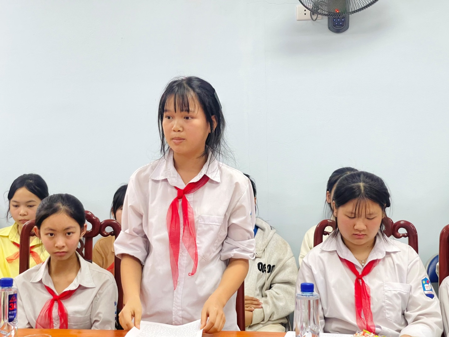 Giáo viên và học sinh phát biểu tại hội nghị gặp mặt.