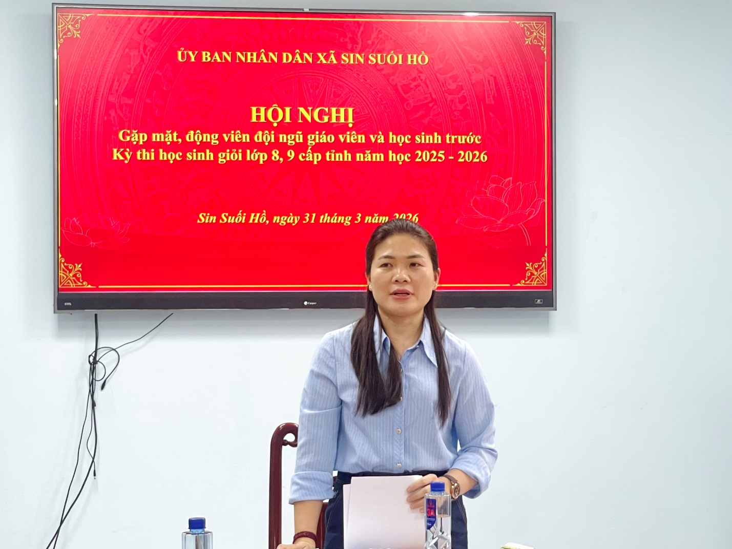 Chiều ngày 31/3, Ủy ban nhân dân xã Sin Suối Hồ đã tổ chức Gặp mặt, động viên đội ngũ giáo viên và học sinh trước kỳ thi học sinh giỏi lớp 8,9 cấp tỉnh năm học 2025 – 2026. Đồng chí Thùng Thị Tâm - Ủy viên BCH Đảng bộ, Trưởng Phòng Văn hóa – Xã hội xã chủ trì hội nghị.
