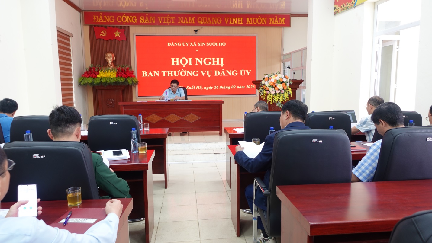 Chiều ngày 26/2/2026, Ban Thường vụ Đảng ủy xã Sin Suối Hồ tổ chức hội nghị để cho ý kiến và quyết định một số nội dung quan trọng. Đồng chí Trịnh Văn Đoàn - Bí thư Đảng ủy, Chủ tịch HĐND xã chủ trì hội nghị. Dự hội nghị có các đồng chí Ủy viên Ban Thường vụ Đảng ủy, Văn phòng Đảng uỷ xã.