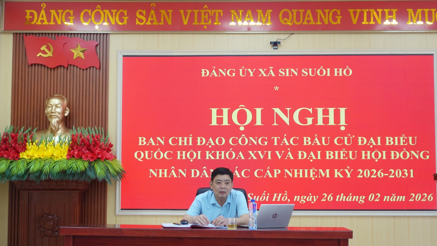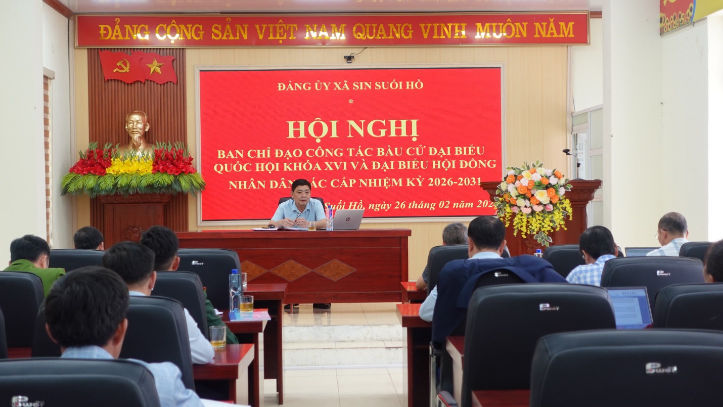 Chiều ngày 26/2/2026, Ban Chỉ đạo công tác bầu cử đại biểu Quốc hội khoá XVI và đại biểu HĐND các cấp nhiệm kỳ 2026 – 2031 xã Sin Suối Hồ tổ chức hội nghị để triển khai các nhiệm vụ quan trọng chuẩn bị cho cuộc bầu cử đại biểu Quốc hội khoá XVI và đại biểu HĐND các cấp nhiệm kỳ 2026 – 2031 trên địa bàn xã. Đồng chí Trịnh Văn Đoàn – Bí thư Đảng uỷ, Chủ tịch HĐND xã chủ trì hội nghị.