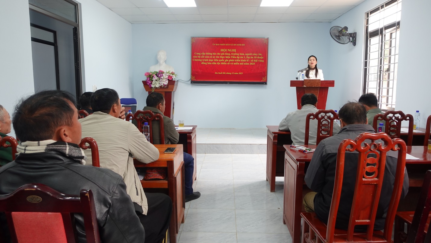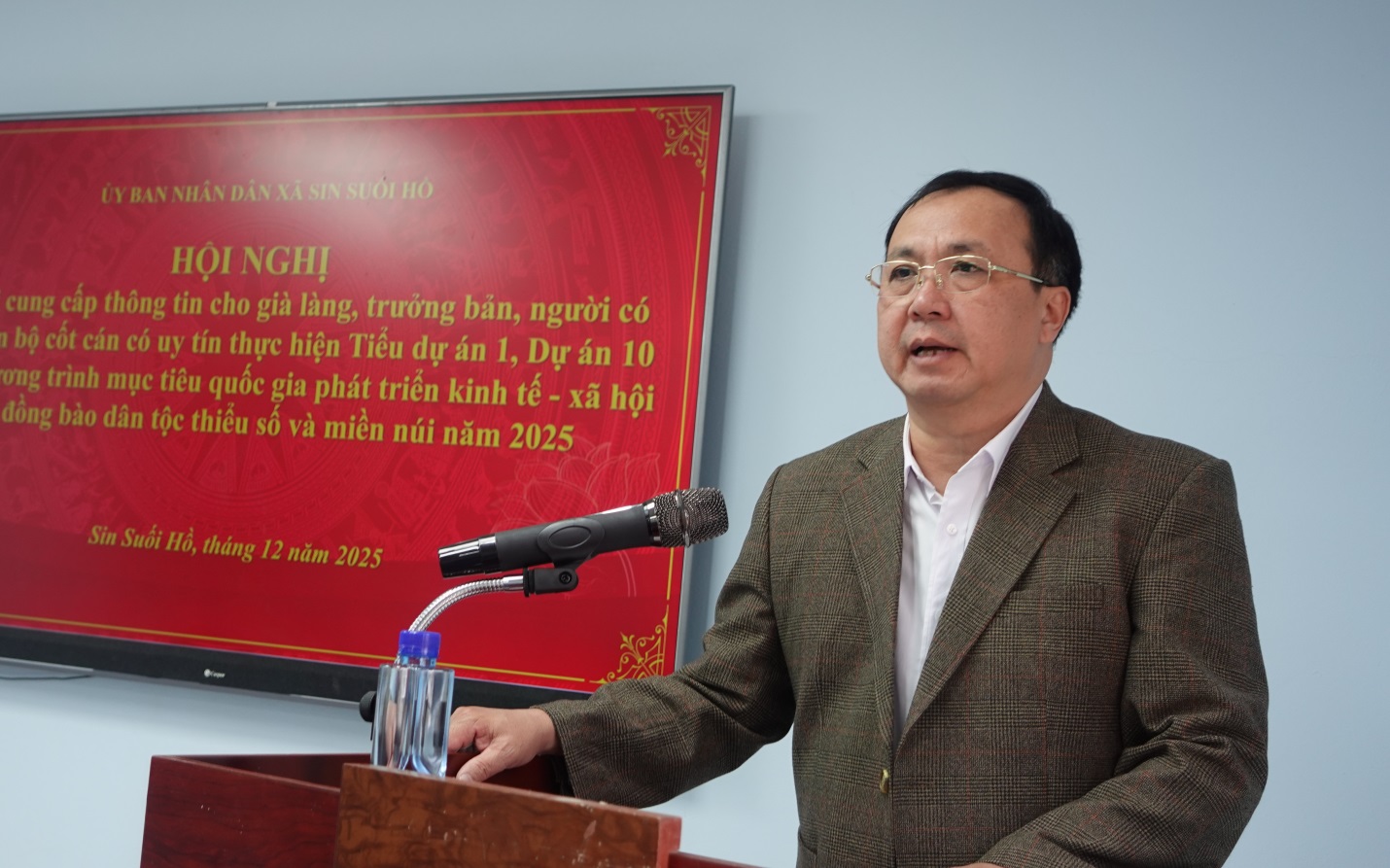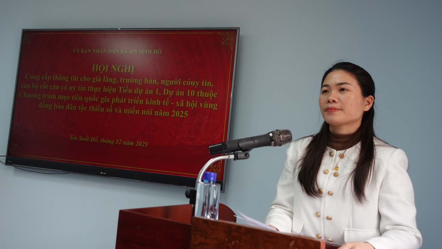 Sáng ngày 28, 29/12/2025, UBND xã Sin Suối Hồ tổ chức Hội nghị cung cấp thông tin cho già làng, trưởng bản, người có uy tín, cán bộ cốt cán uy tín thực hiện Tiểu dự án 1, Dự án 10 thuộc chương trình mục tiêu Quốc gia phát triển kinh tế - xã hội vùng đồng bào dân tộc thiểu số và miền núi năm 2025. Dự Hội nghị có đồng chí: Trịnh Văn Đoàn – Bí thư Đảng ủy xã; các đồng chí Thường trực, Thường vụ Đảng ủy, HĐND, UBND xã; Trưởng các Ban Đảng, lãnh đạo Phòng Văn hóa – Xã hội và Trưởng bản, người có uy tín, cán bộ cốt cán uy tín của 35 bản trên địa bàn xã.