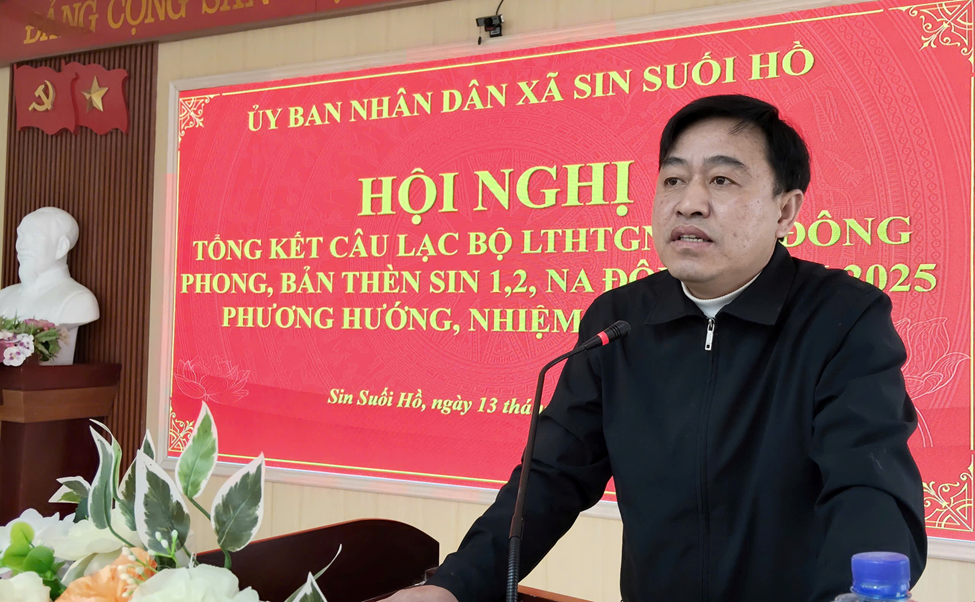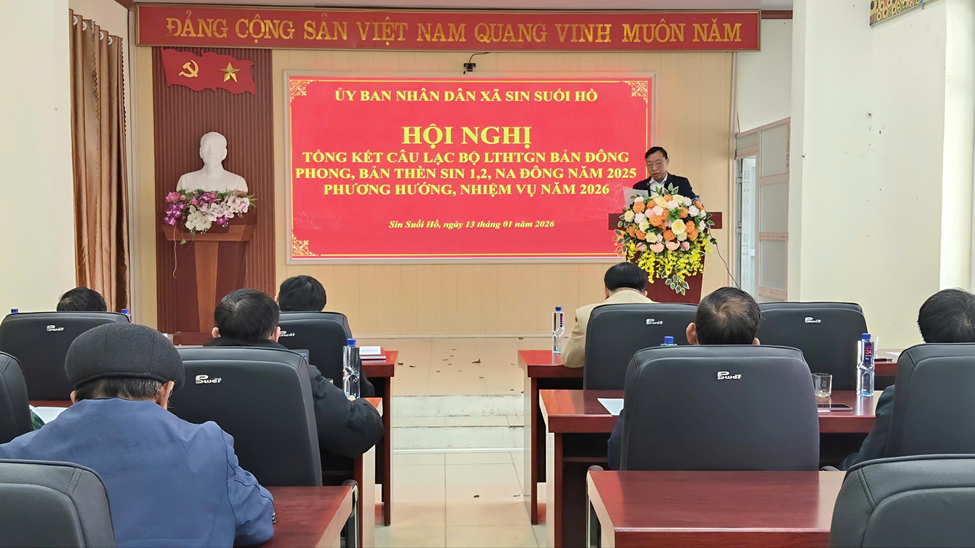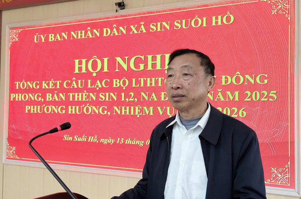 Sáng nay (13/1), UBND xã Sin Suối Hồ tổ chức Hội nghị tổng kết Câu lạc bộ liên thế hệ tự giúp nhau (CLB LTHTGN) bản Đông Phong, Thèn Sin 1,2, Na Đông năm 2025, triển khai phương hướng, nhiệm vụ năm 2026. Dự hội nghị có đồng chí Giàng A Vư - Phó Bí thư Thường trực Đảng ủy xã; các đồng chí Thường trực HĐND, UBND xã, thành viên CLB.