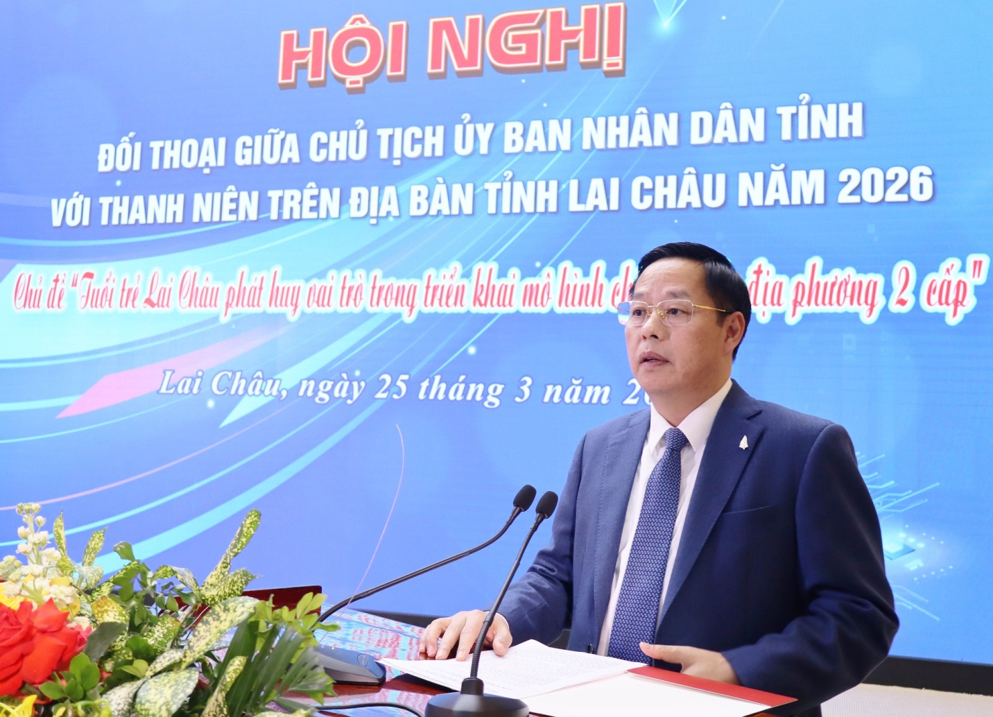 Chiều 25/3, tại Trung tâm Hội nghị - Văn hóa tỉnh, UBND tỉnh tổ chức Hội nghị trực tiếp và trực tuyến Chương trình đối thoại giữa Chủ tịch UBND tỉnh với thanh niên trên địa bàn tỉnh Lai Châu năm 2026 với chủ đề “Tuổi trẻ Lai Châu phát huy vai trò trong triển khai mô hình chính quyền địa phương hai cấp”. Đồng chí Hà Quang Trung - Phó Bí thư Tỉnh ủy, Chủ tịch UBND tỉnh chủ trì Hội nghị.