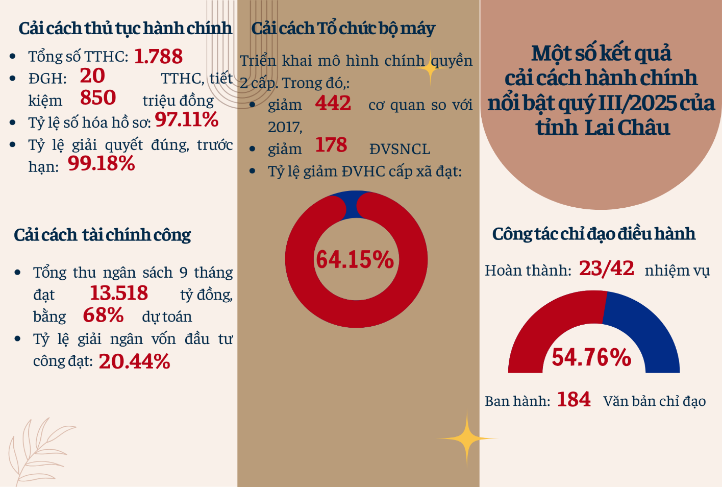 Ngày 19/9/2025, UBND tỉnh Lai Châu ban hành Báo cáo số 598-BC/UBND về kết quả thực hiện công tác cải cách hành chính quý III năm 2025 và nhiệm vụ, giải pháp quý IV năm 2025 trên địa bàn tỉnh. Báo cáo phân tích rõ kết quả triển khai trên 6 lĩnh vực trọng tâm, đồng thời nêu bật những kết quả nổi bật của từng lĩnh vực cụ thể như sau: