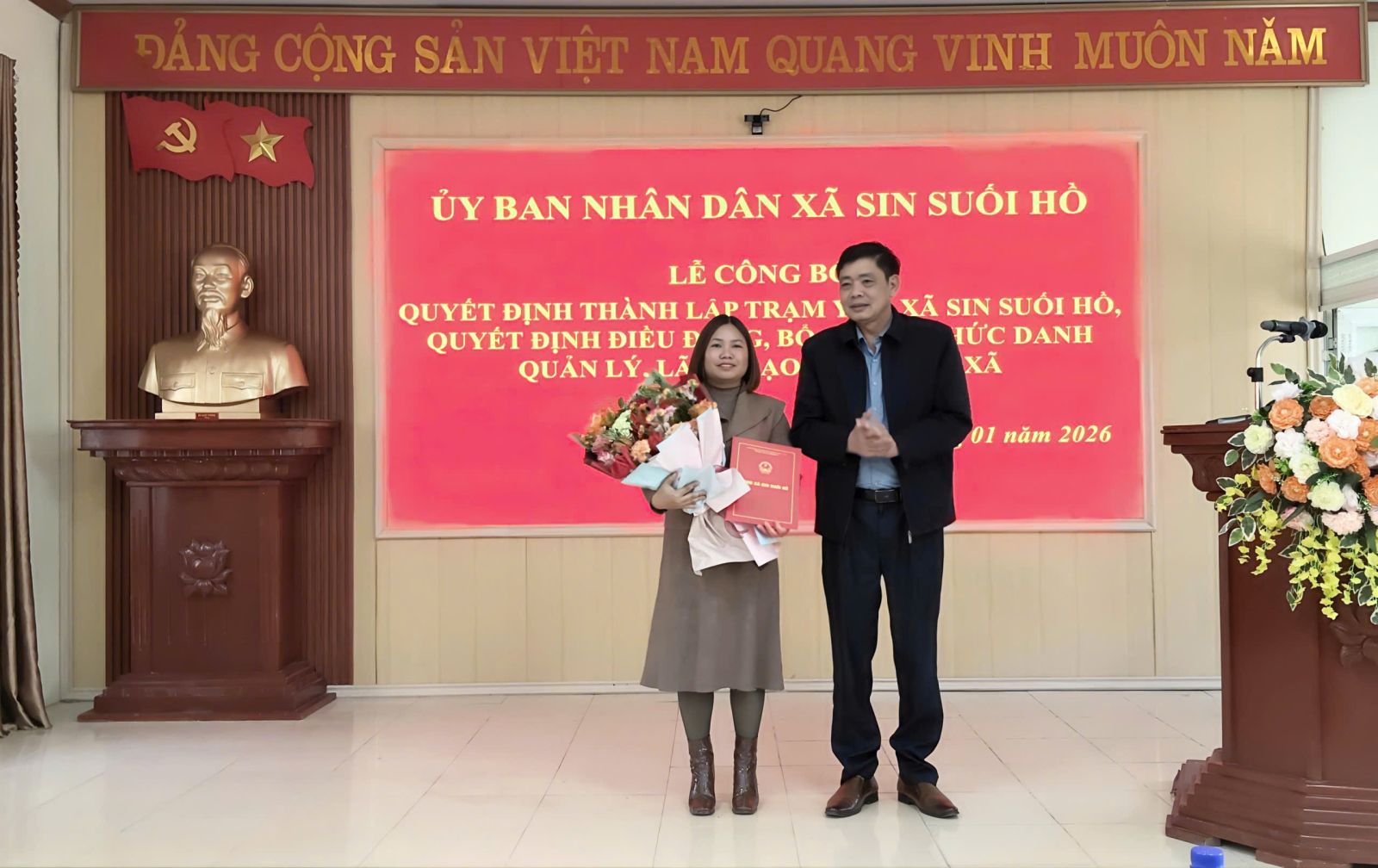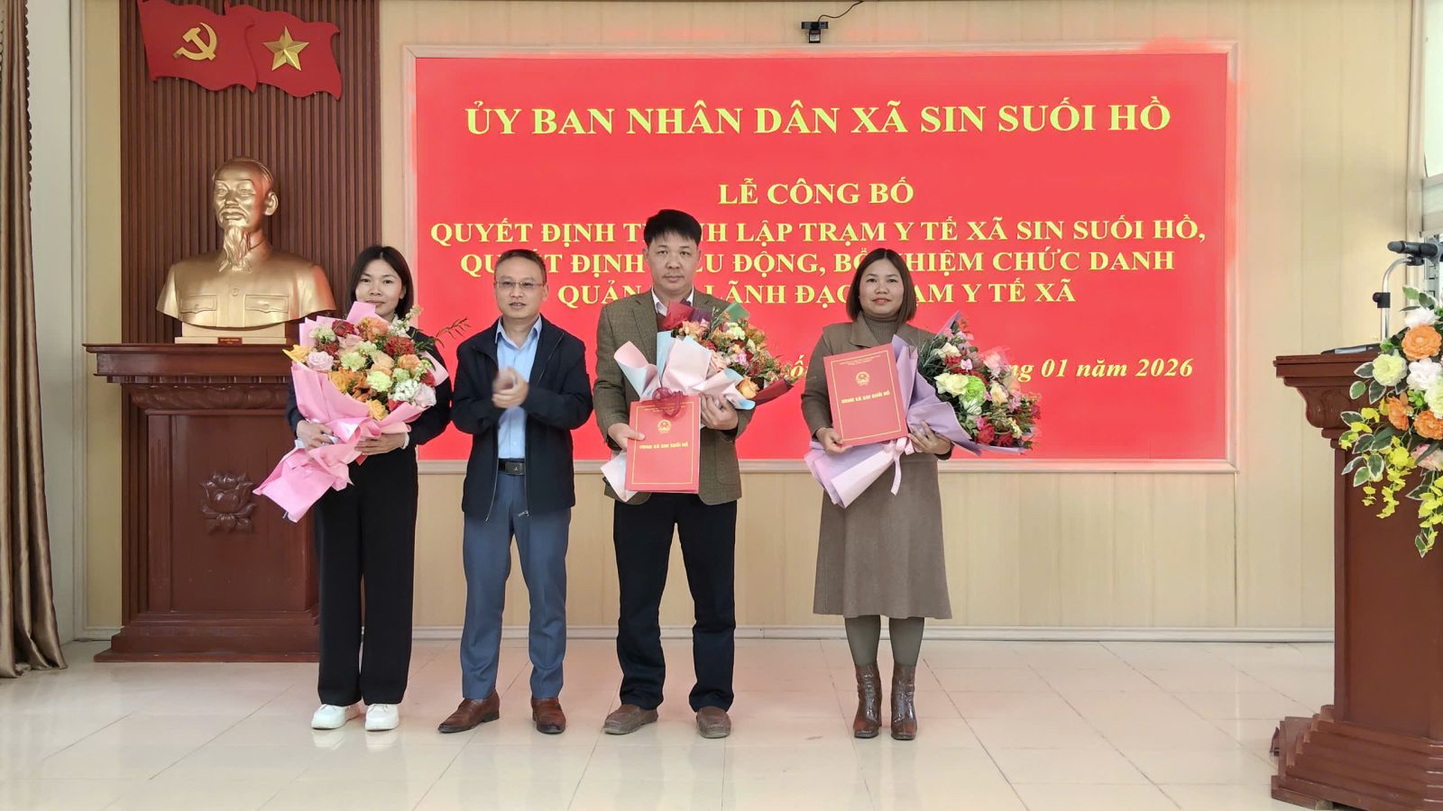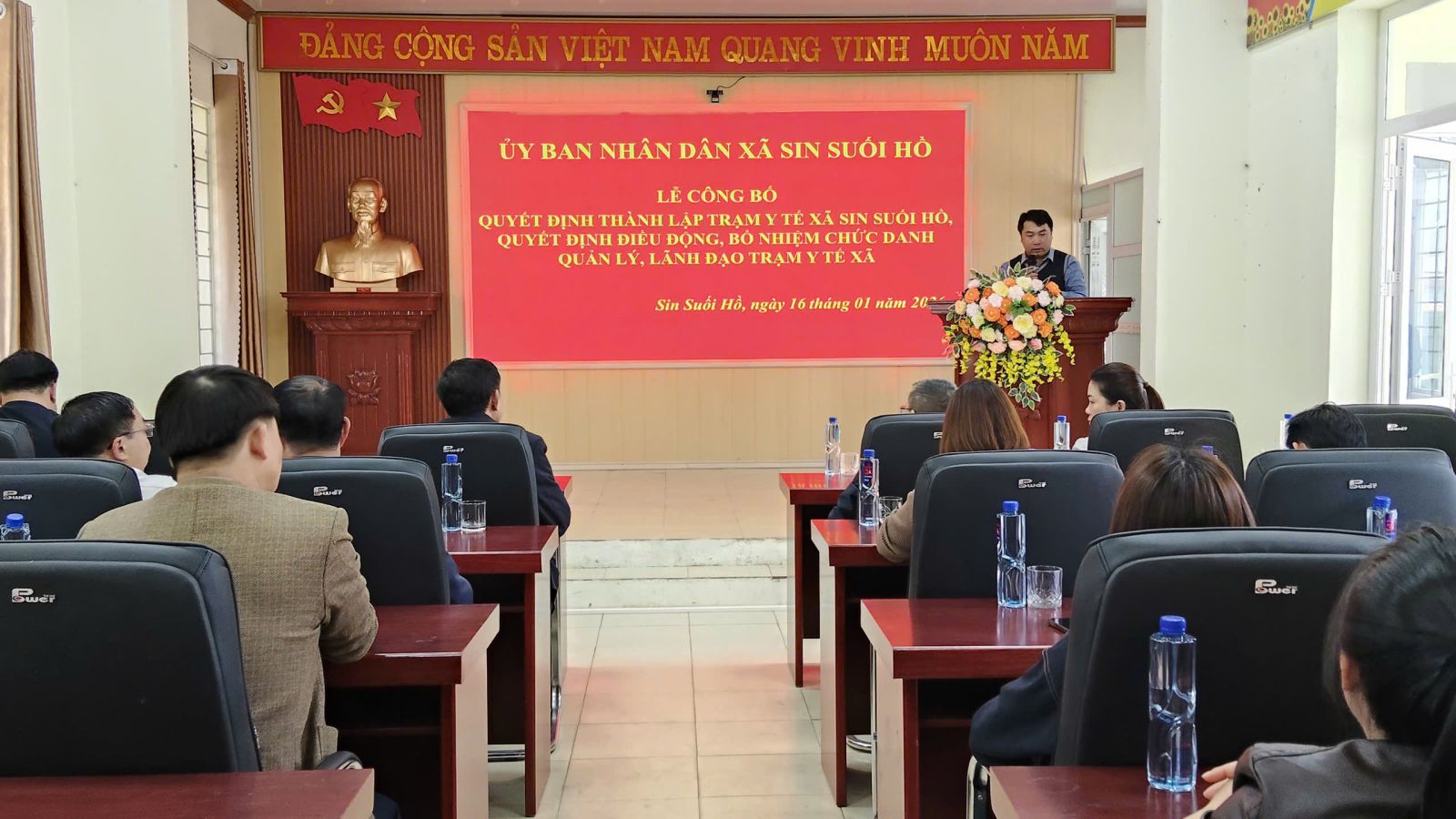 Chiều nay (16/1), tại Nhà Văn hóa xã Sin Suối Hồ, UBND xã Sin Suối Hồ đã long trọng tổ chức Lễ công bố Quyết định về việc thành lập Trạm y tế xã và Quyết định điều động, bổ nhiệm chức danh lãnh đạo, quản lý Trạm y tế xã. Tham dự buổi lễ có các đồng chí Trịnh Văn Đoàn - Bí thư Đảng ủy, Chủ tịch HĐND xã; các đồng chí Thường trực Đảng ủy, Thường trực HĐND, Lãnh đạo UBND xã, đại diện Ủy ban MTTQ Việt Nam và các tổ chức chính trị - xã hội, cùng lãnh đạo các cơ quan chuyên môn trực thuộc UBND xã và các viên chức được điều động.