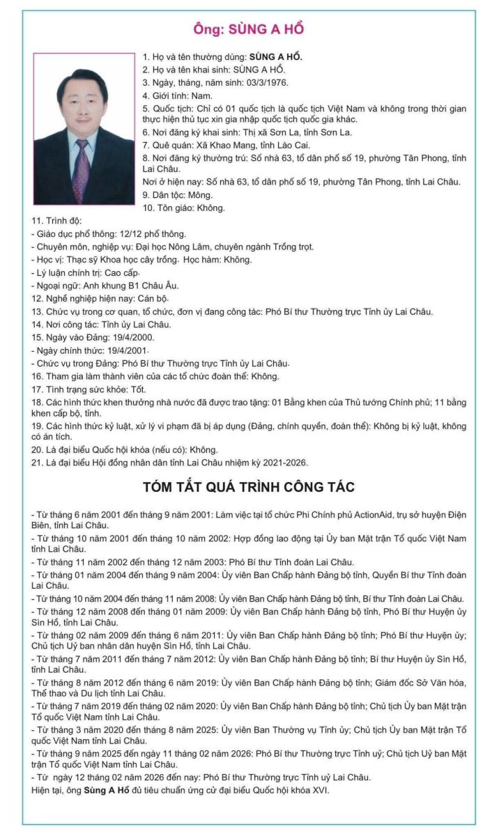 TIỂU SỬ TÓM TẮT CỦA NGƯỜI ỨNG CỬ ĐẠI BIỂU QUỐC HỘI KHÓA XVI ĐƠN VỊ BẦU CỬ SỐ 02 TỈNH LAI CHÂU GỒM CÁC PHƯỜNG: TÂN PHONG, ĐOÀN KẾT VÀ CÁC XÃ: BẢN BO, BÌNH LƯ, TẢ LÈNG, KHUN HÁ, SIN SUỐI HỒ, PHONG THỔ, SÌ LỞ LẦU, DÀO SAN, KHỔNG LÀO, NẬM TĂM, PU SAM CÁP, NẬM MẠ, NẬM CUỔI