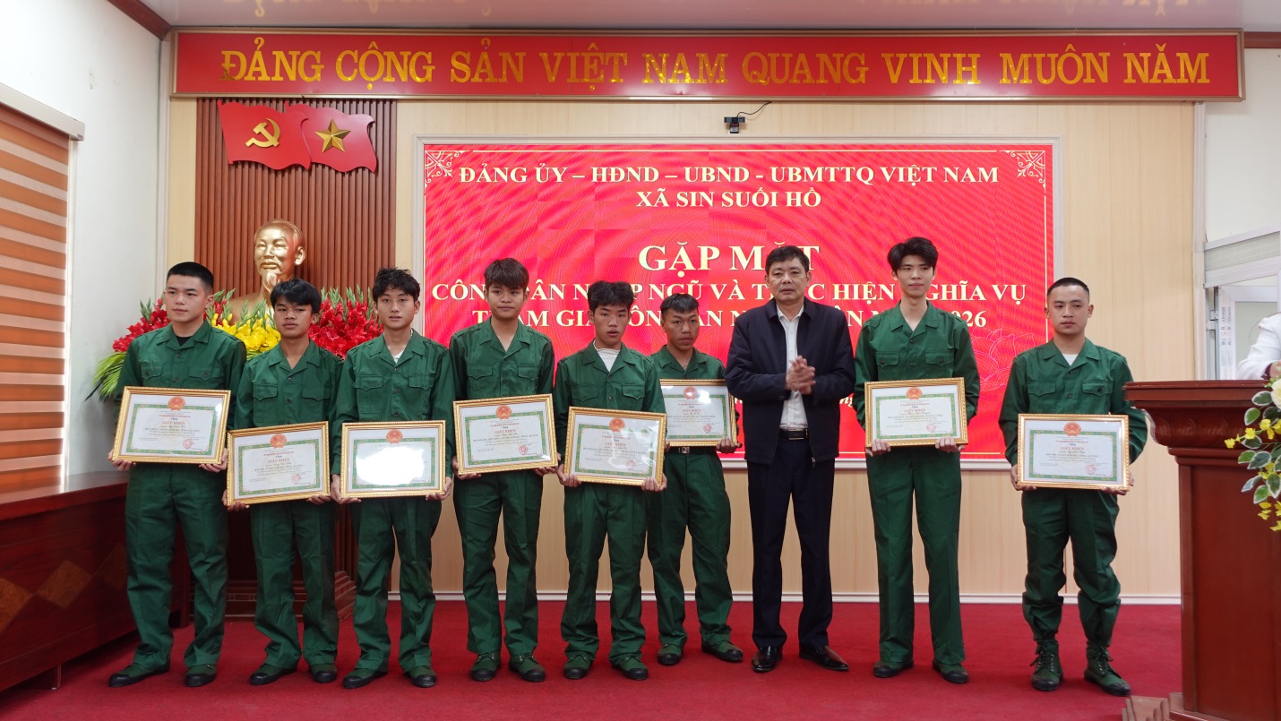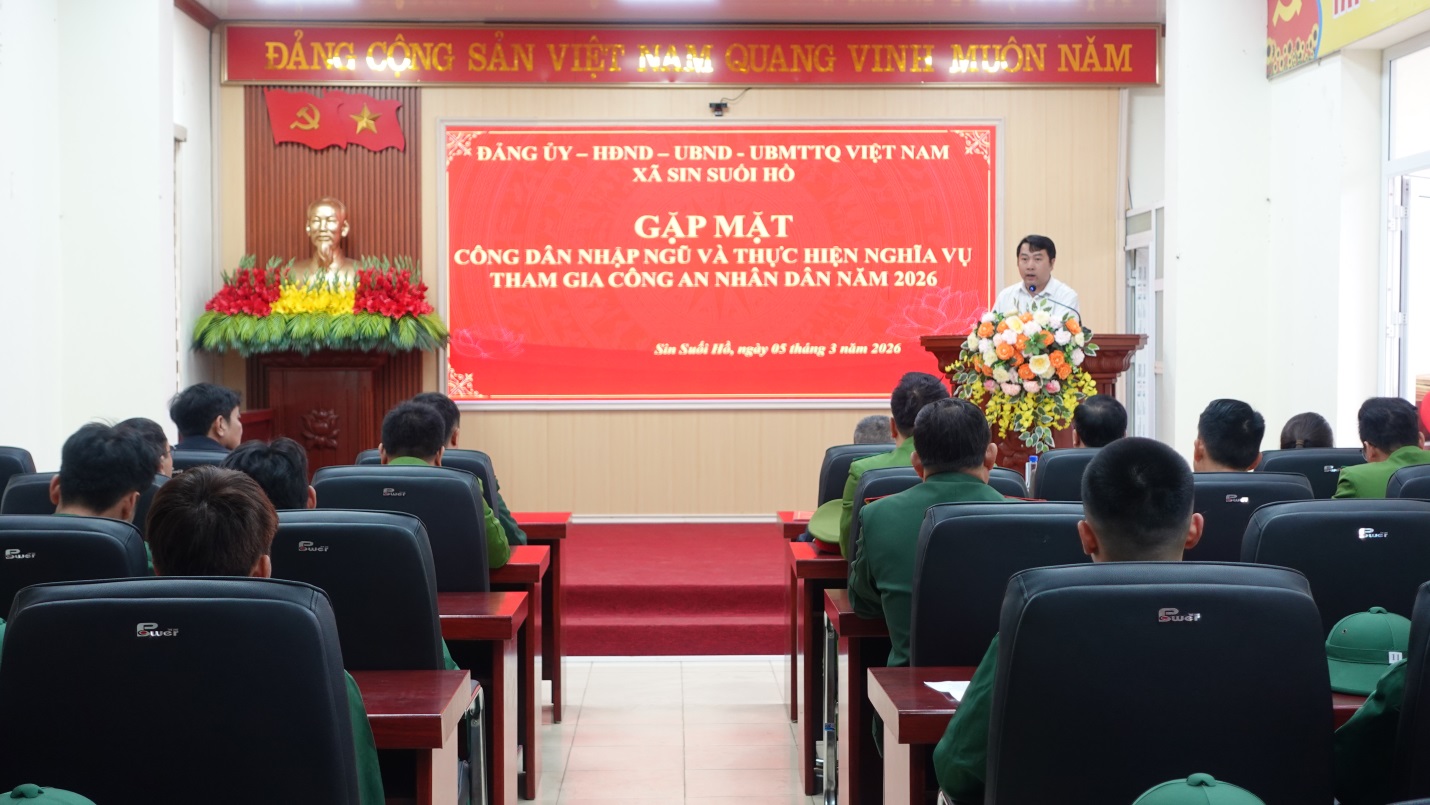 Sáng nay 05/3, xã Sin Suối Hồ tổ chức gặp mặt công dân lên đường thực hiện nghĩa vụ quân sự và nghĩa vụ tham gia Công an nhân dân năm 2026. Dự buổi gặp mặt có đồng chí Trịnh Văn Đoàn – Bí thư Đảng ủy, Chủ tịch HĐND xã; đồng chí Nguyễn Mạnh Cường – Phó Bí thư, Chủ tịch UBND xã; các đồng chí Ủy viên Thường vụ Đảng ủy, lãnh đạo UBND, lãnh đạo các cơ quan, đơn vị xã; các thanh niên ưu tú chuẩn bị lên đường nhập ngũ năm 2026 và đông đảo nhân dân trên địa bàn xã.
