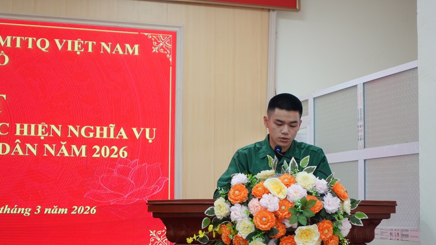 Đại diện tân binh phát biểu cảm tưởng, bày tỏ niềm vinh dự, tự hào khi được đứng trong hàng ngũ Quân đội nhân dân, Công an nhân dân và hứa sẽ nỗ lực rèn luyện, quyết tâm hoàn thành tốt nhiệm vụ.