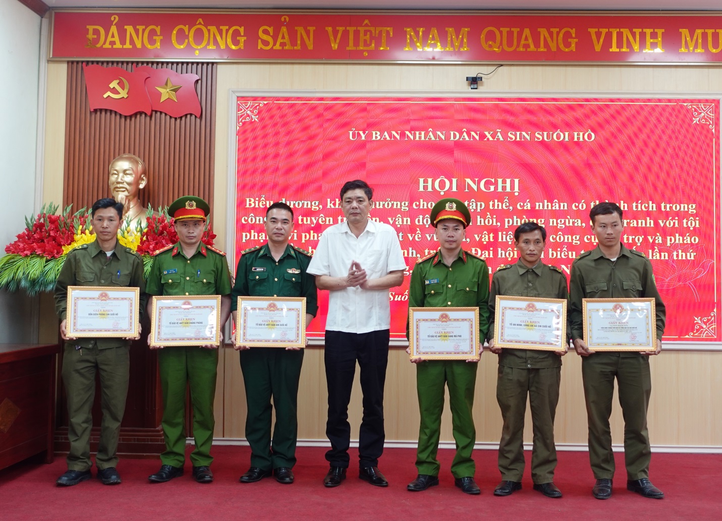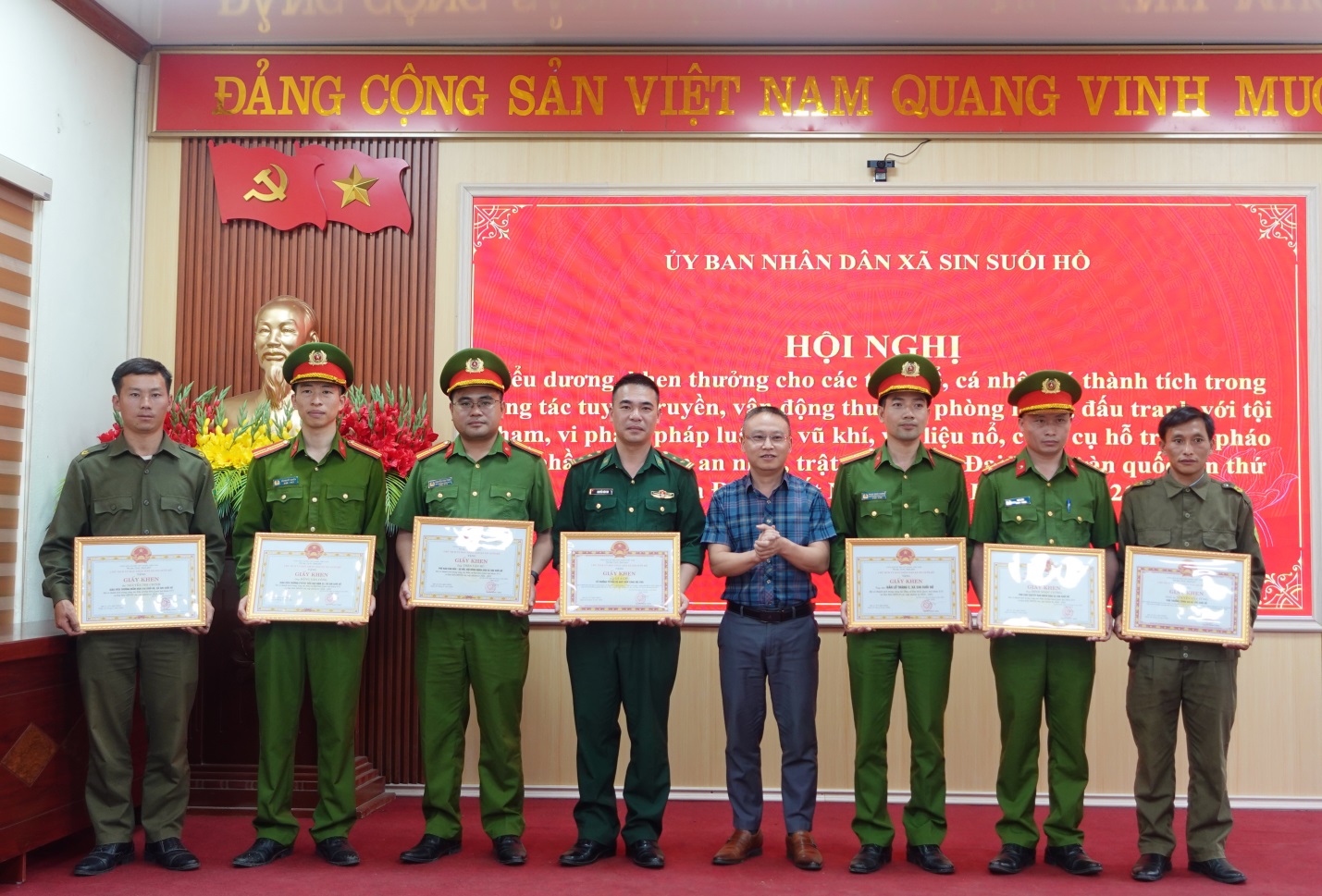 Cũng nhân dịp này, Chủ tịch UBND xã đã tặng giấy khen cho 6 tập thể, 9 cá nhân có thành tích trong công tác tuyên truyền, vận động thu hồi, phòng ngừa, đấu tranh với tội phạm vi phạm pháp luật về vũ khí, vật liệu nổ, công cụ hỗ trợ và pháo, góp phần đảm bảo an ninh trật tự Đại hội đại biểu toàn quốc lần thứ XIV của Đảng, Tết Nguyên đán Bính Ngọ 2026.